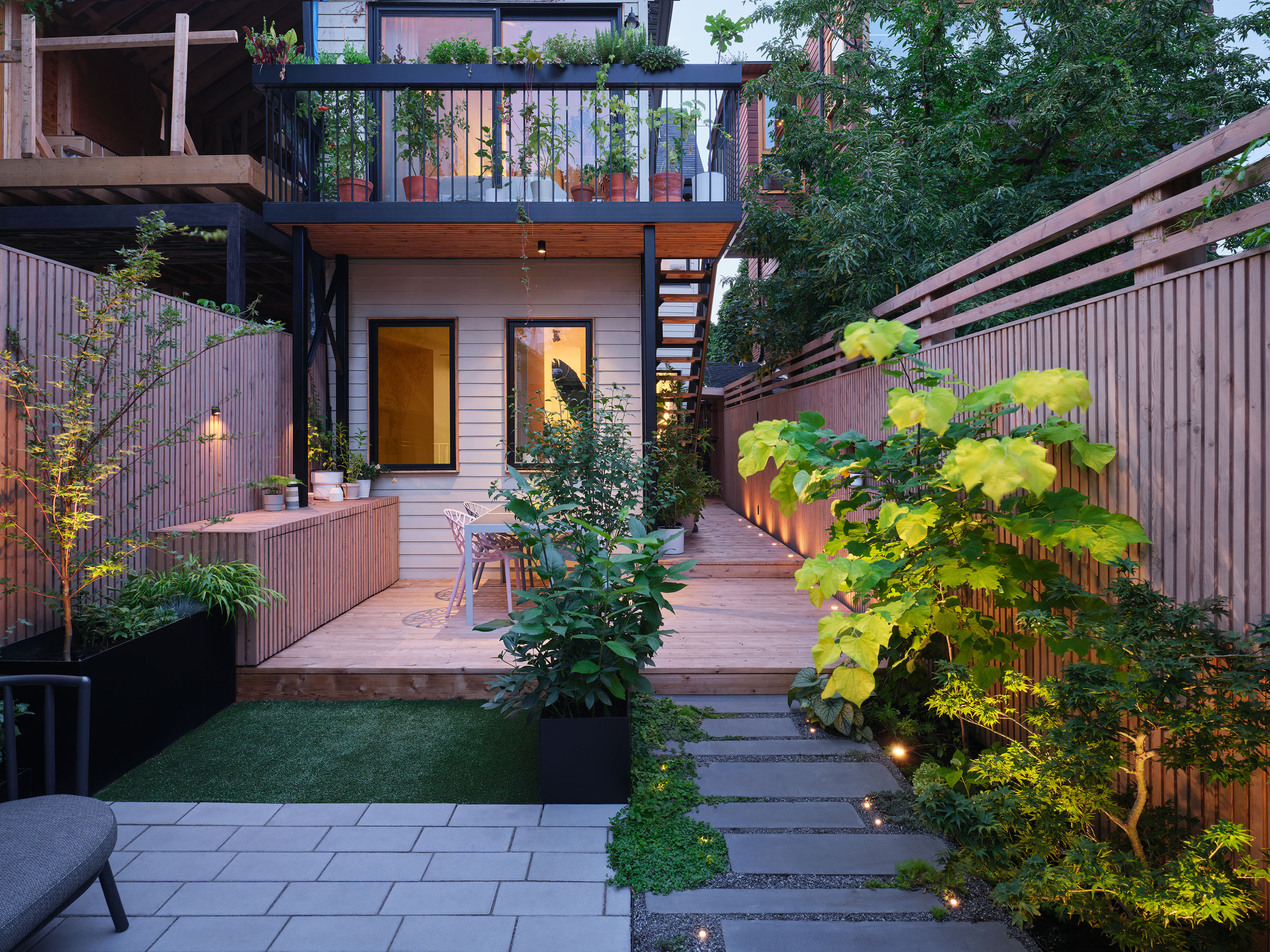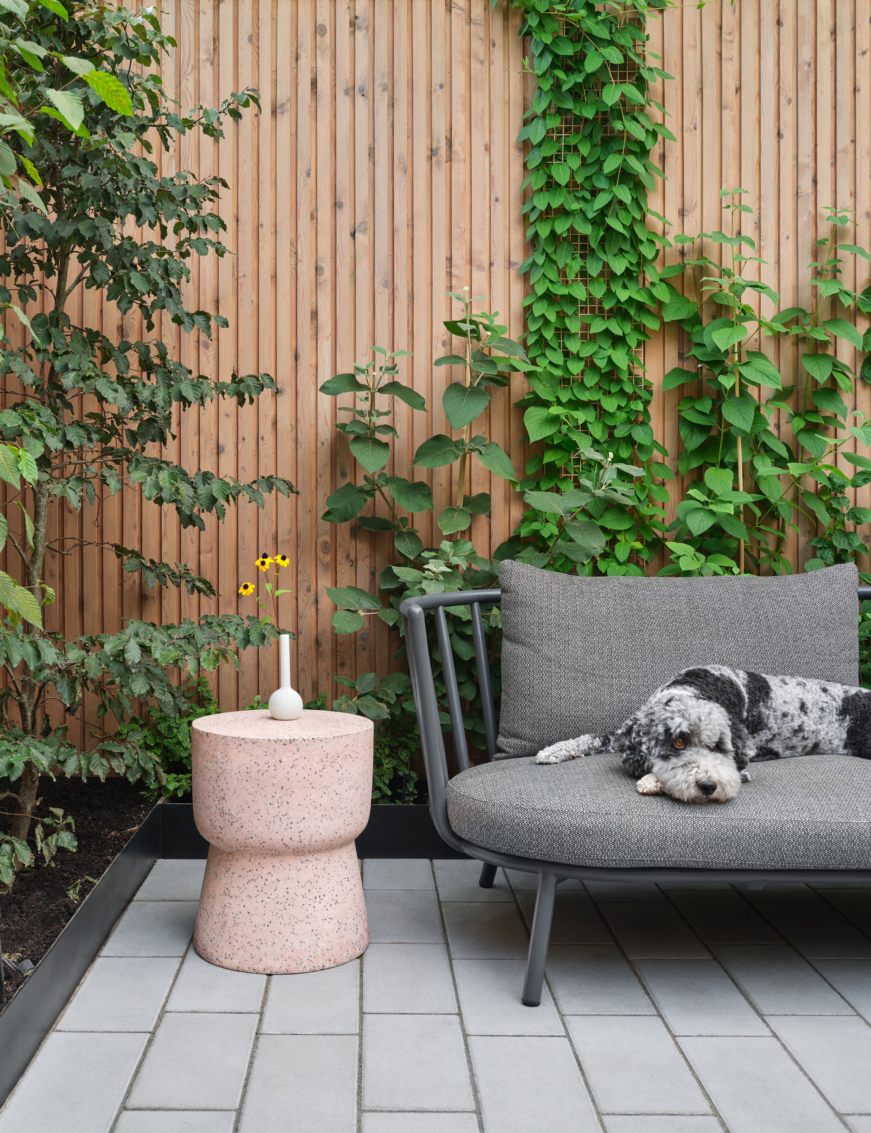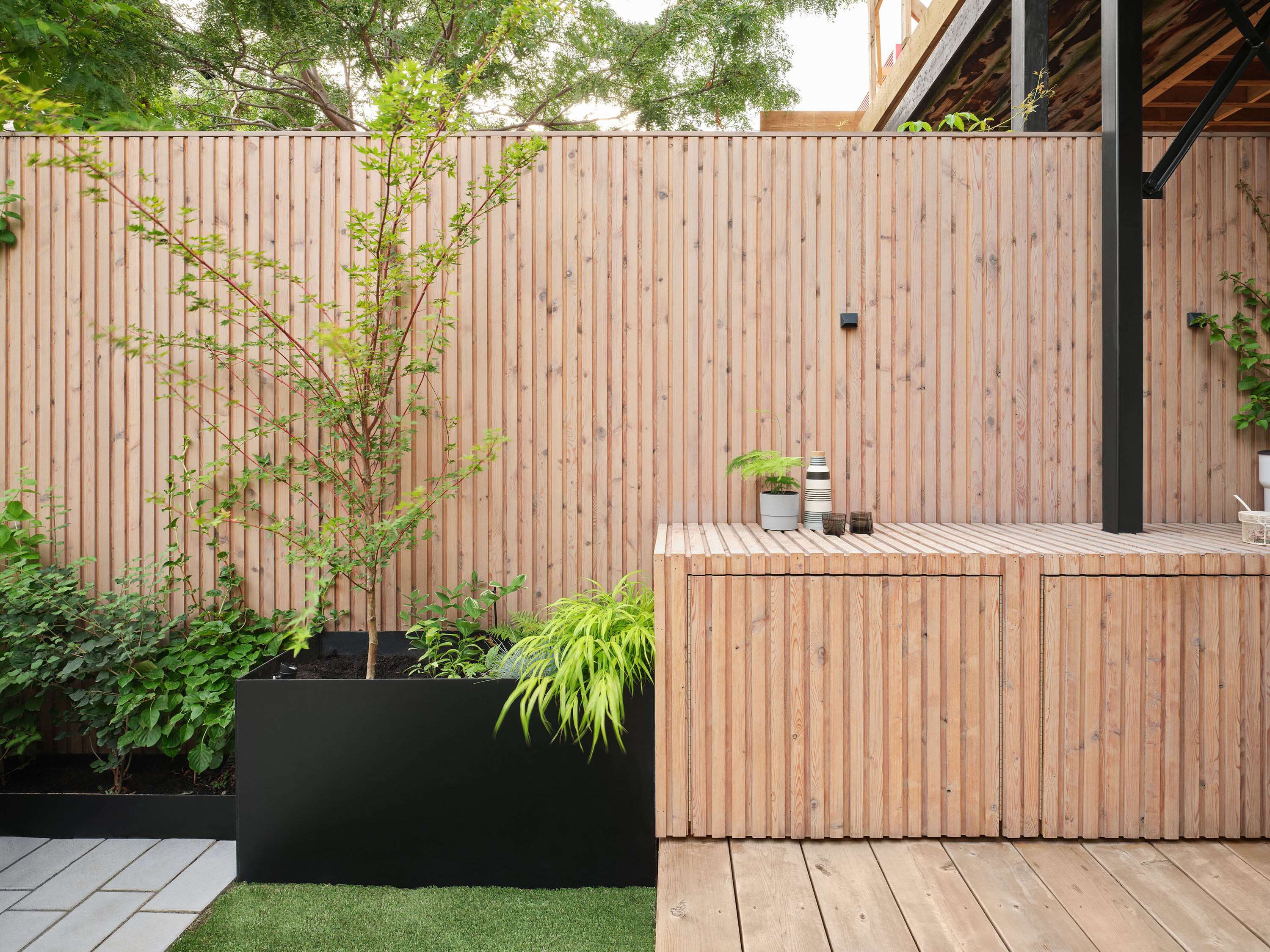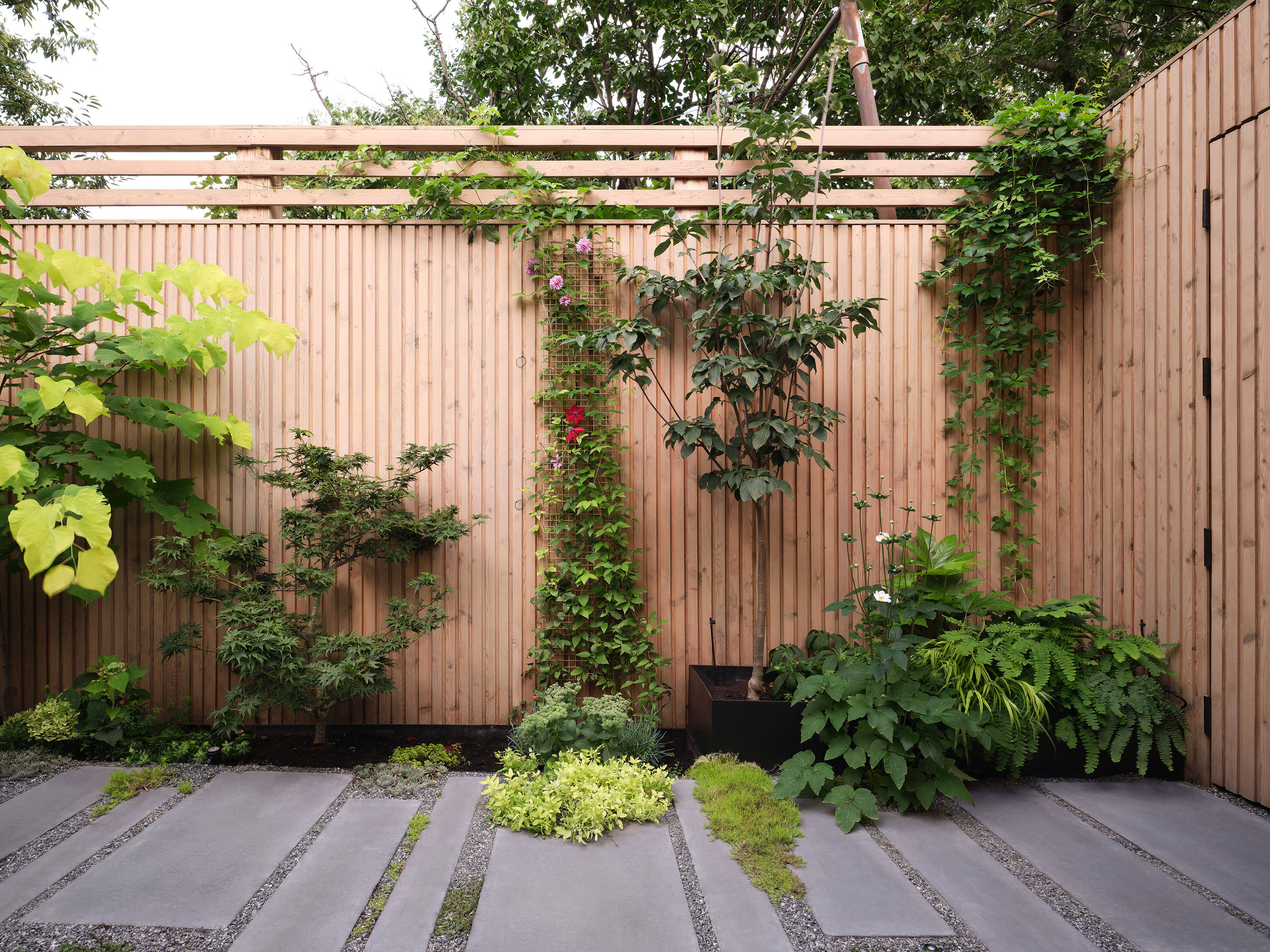 Gallery Garden is an urban oasis project featuring a custom shiplap joint fence in white cedar and custom pavers.