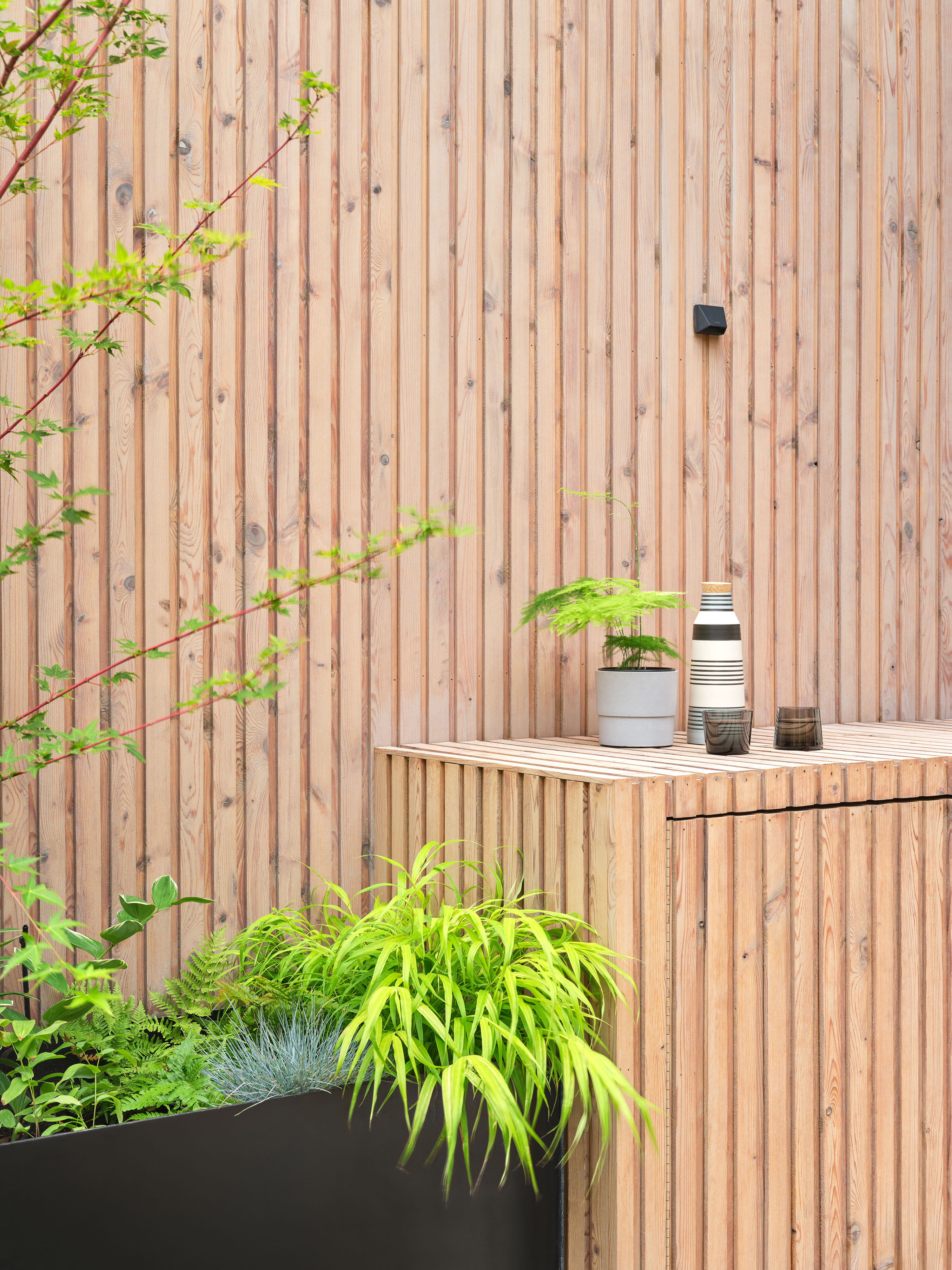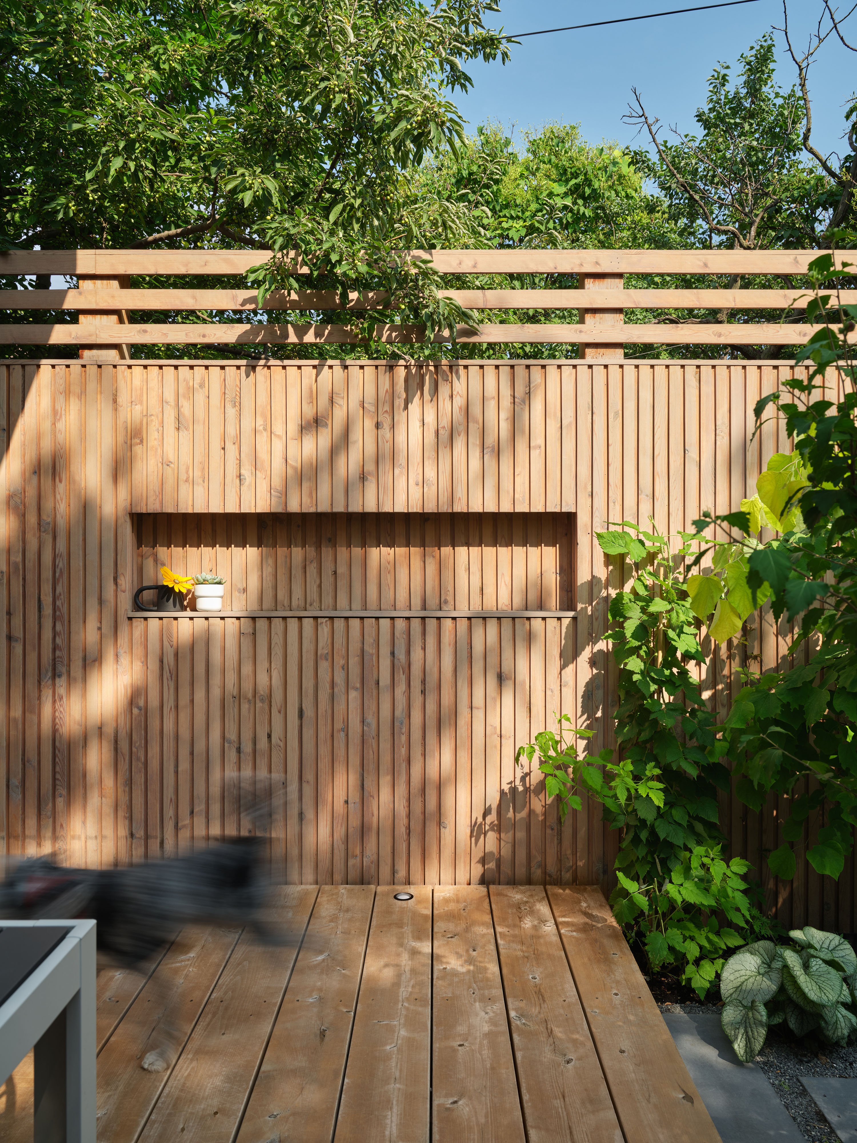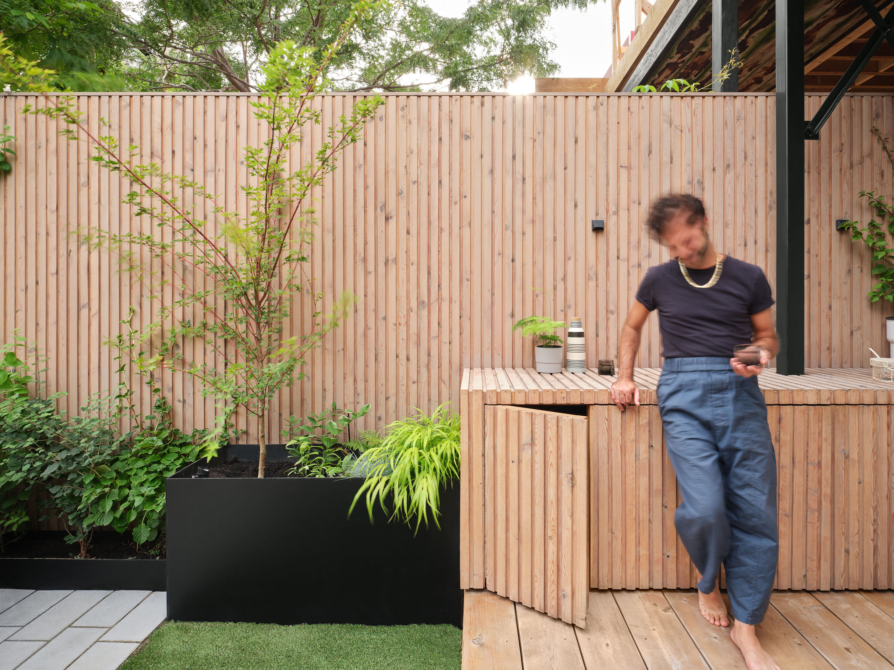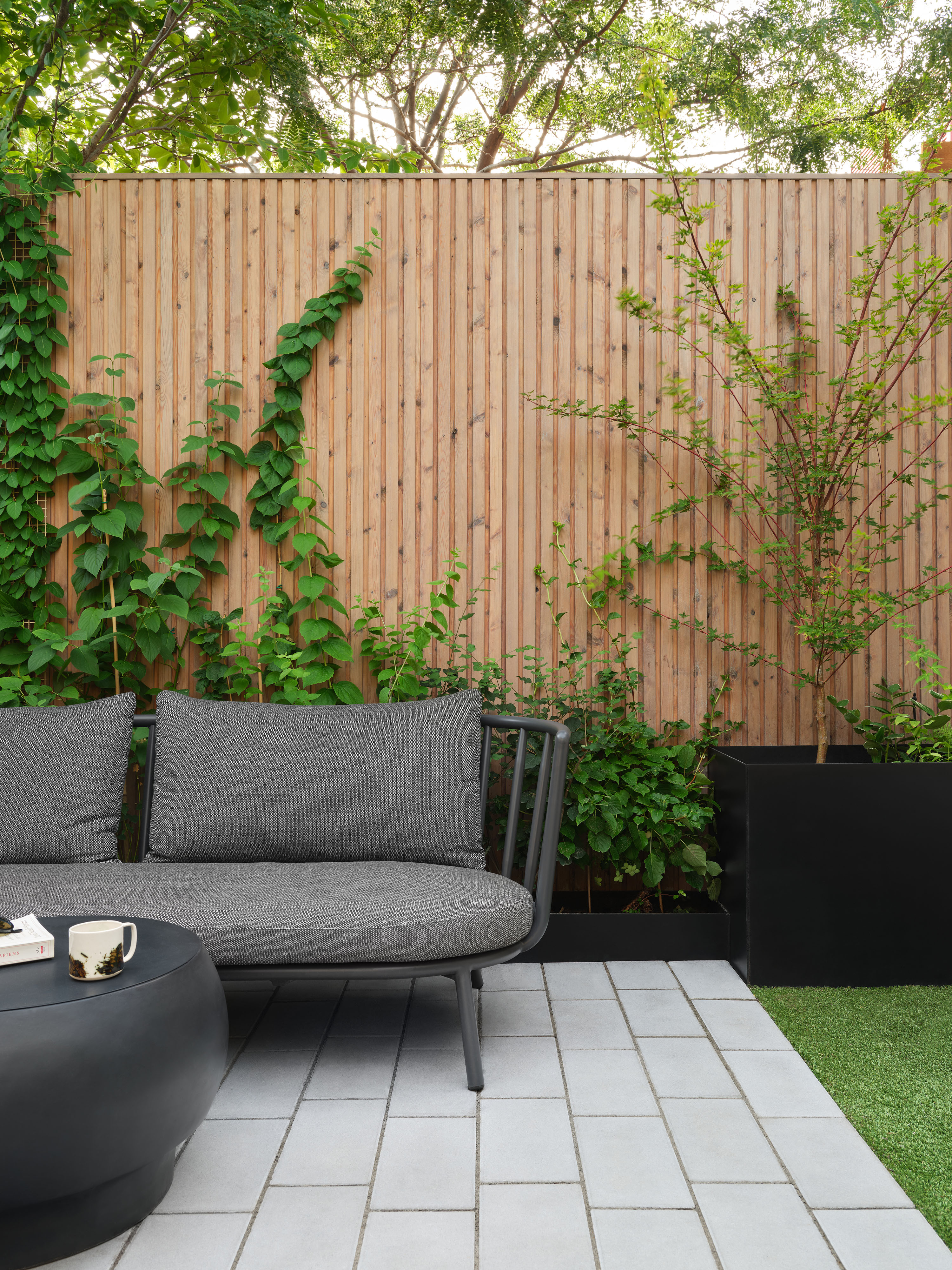 Gallery Garden is an urban oasis project featuring a custom shiplap joint fence in white cedar and custom pavers.