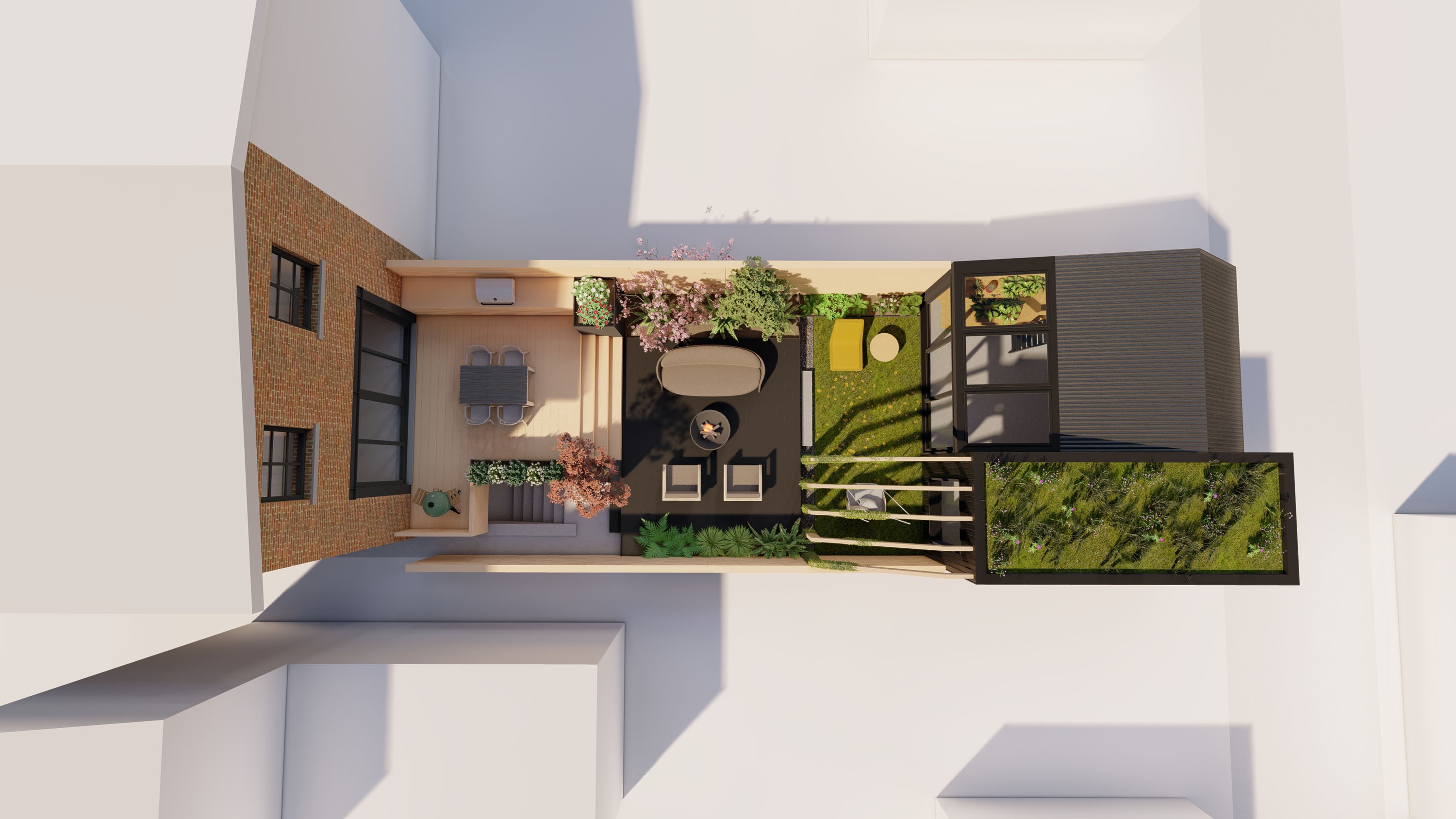 An urban oasis with tiered wood terraces featuring a garage design doubling as a greenhouse for a Little Italy home.